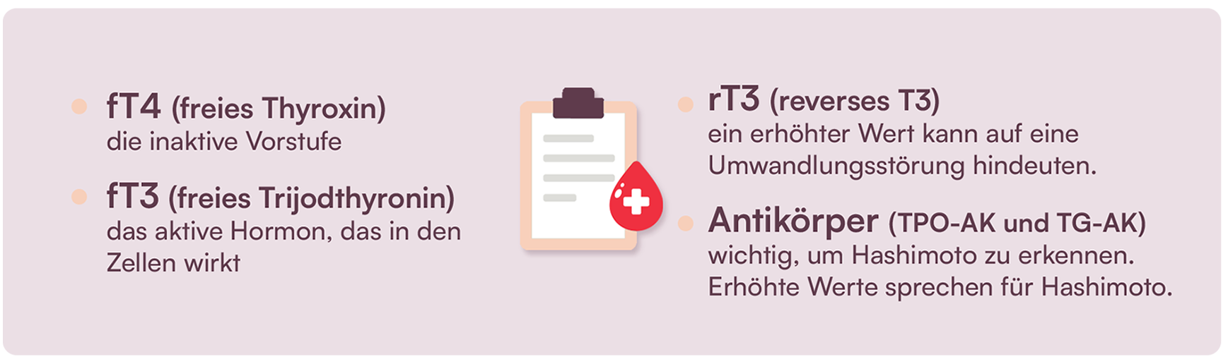 Viele Ärzte verlassen sich bei der Diagnostik ausschließlich auf den TSH-Wert. Doch TSH zeigt nur, was im Gehirn passiert, also ob dein Gehirn Signale an deine Schilddrüse sendet. Der TSH- Wert zeigt aber nicht, ob in den Zellen tatsächlich genug aktives Schilddrüsenhormon T3 ankommt. Für eine vollständige Diagnose solltest du zusätzlich folgende Werte bestimmen lassen: